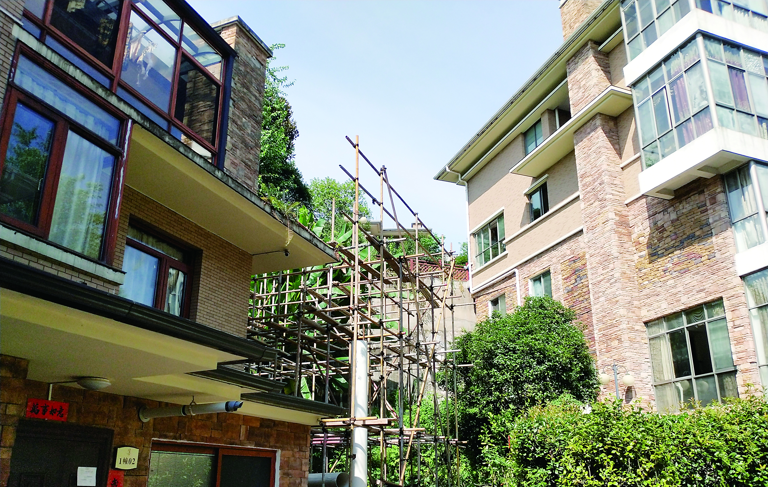 7月18日,1栋02号别墅业主再次动工,施工队一天之内搭起了3层楼高的构筑物。为了阻止邻居施工,21日早上,胡先生驾车直接堵在凌女士家大门口,于是才有了上文中的场景。