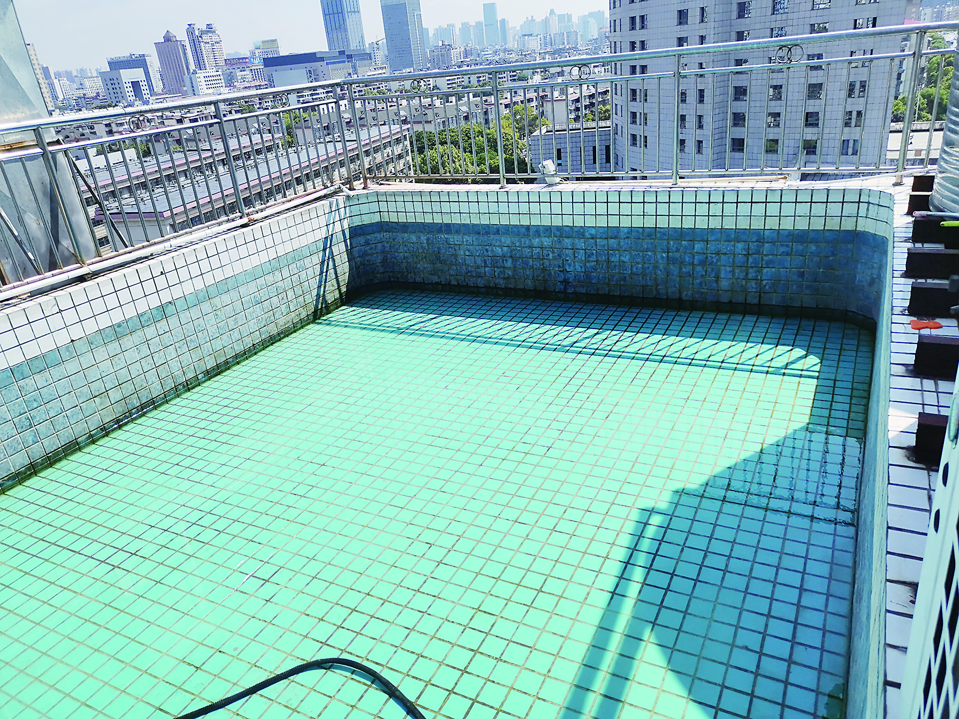 ▲楼顶游泳池的水已放干。记者/姚时美 摄
