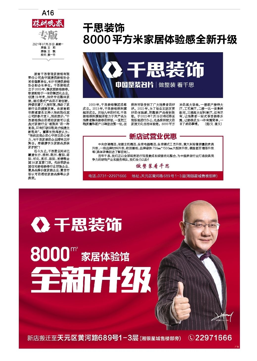 2003年,千思装饰集团总部成立。2013年,千思装饰株洲旗舰店成立。历经九年的时间,千思装饰株洲旗舰店致力于用产品为消费者解决装修的烦恼,一直把工程质量和客户口碑放在第一位,在株洲市场受到了广大消费者的好评。2021年,为了给业主朋友更好的体验感,把整装产品做到极致。于2021年7月29日将迁移至现场地进行办公,也是株洲较大的家居文化生活体验馆。8000平方米的超大场地,一楼客户接待大厅,工艺展厅,二楼一比一实景样板间,三楼超大材料展厅,应有尽有,让消费者一站式享受装修乐趣,让装修成为一件有趣简单,一目了然的事情。 (图/文 唐文)