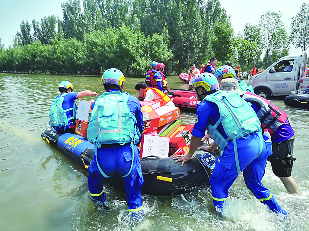 队长王常平说,有些村庄地势低洼,洪水已经淹没二楼,只能用橡皮艇靠近受灾群众。有位老人的家一楼大门被洪水淹没,只能躲在自家二楼避险。队员划着皮划艇靠近房屋,涉水过去开门,再划皮划艇进去,救出老人。