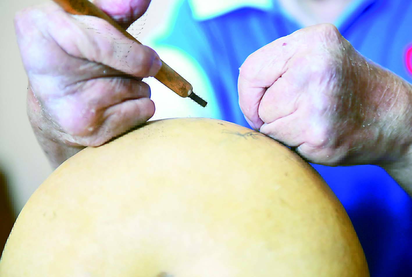 ▲钟根全克服手部关节不灵活的困难,一刀一刀地在葫芦上描绘着自己的精神世界。