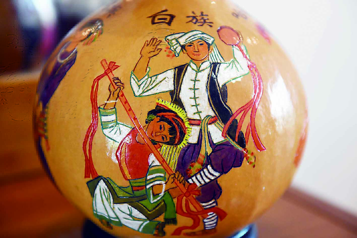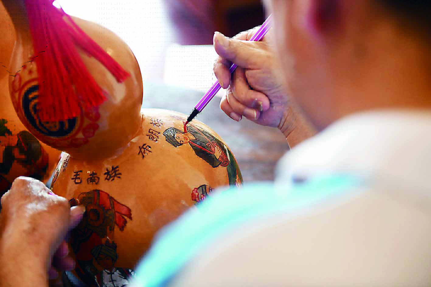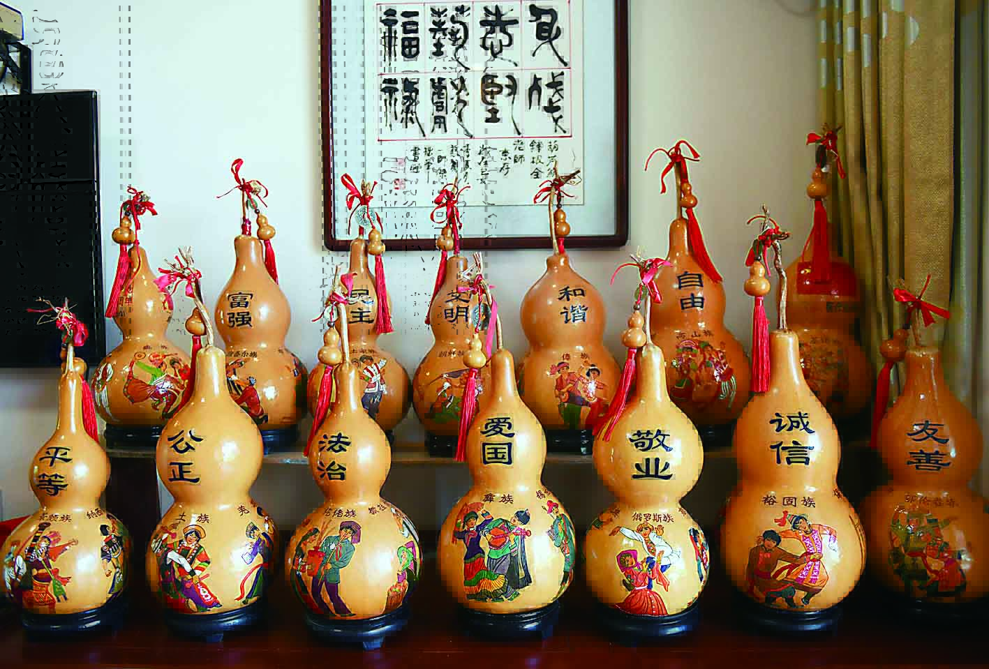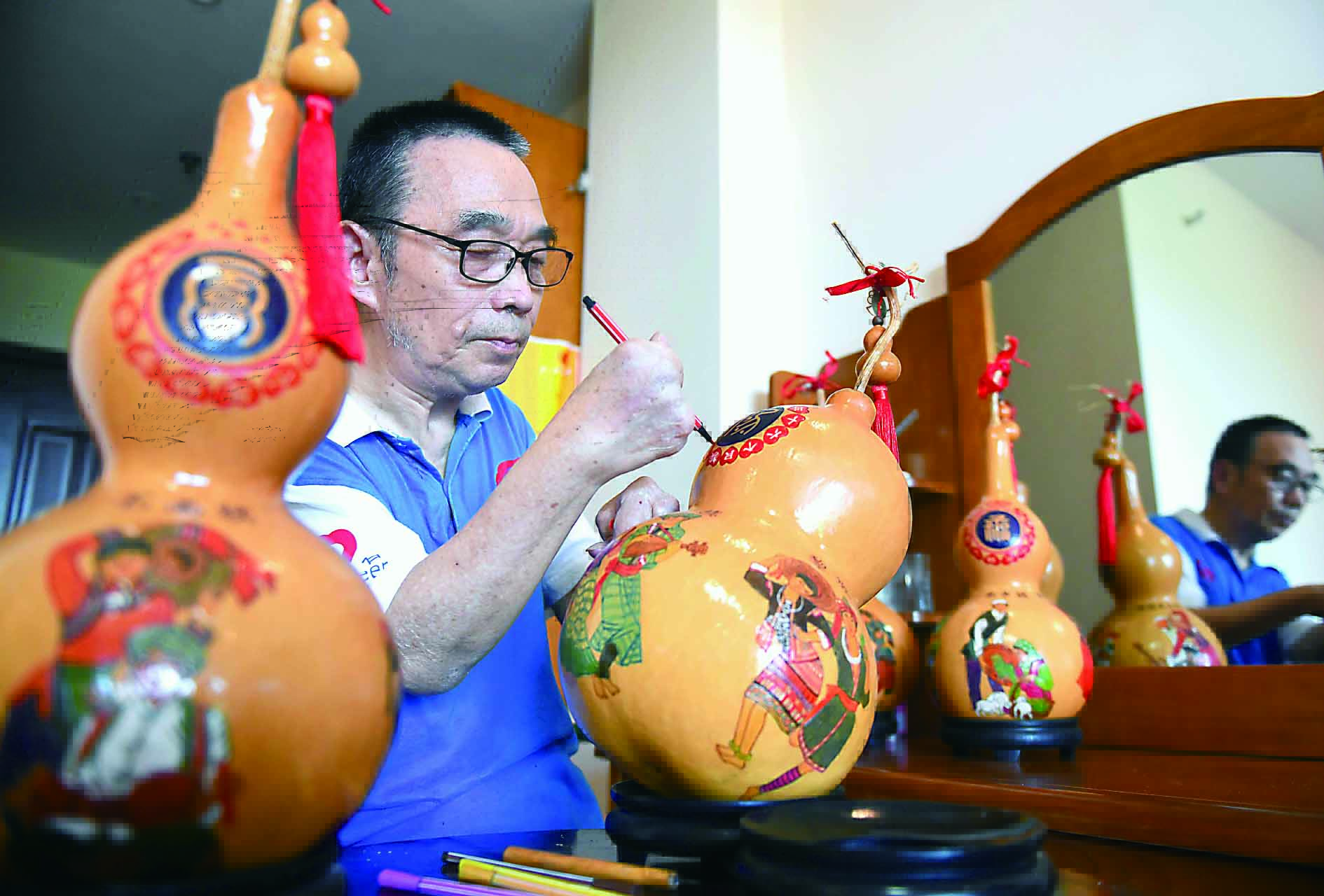 用铅笔在圆润的葫芦上起草,然后一点一点地描绘、刻字、上色……钟根全克服重重困难,完成一系列工序,硬是把一个个普普通通的葫芦,雕琢成一件件精美的艺术品。