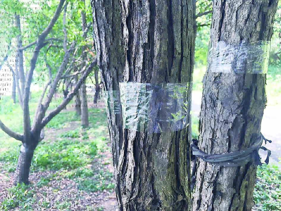 ▲树干上缠绕胶带。 记者/刘平 摄