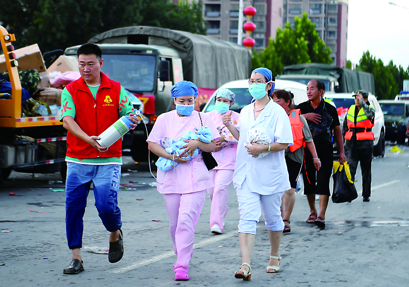 7月26日,医护人员抱着新生儿,向救护车跑去。 受连日强降雨影响,河南省卫辉市新乡医学院第一附属医院被洪水围困,院内断水断电,千余名患者生命安全受到威胁。 医院外几公里的道路被积水淹没,最深处超过2米。 “冲冲冲!”,抬起担架,抱起新生儿,举起输液瓶,争分夺秒奔向转运救护车。救援人员、医护人员、志愿者与时间赛跑,全力解救被困病患。
