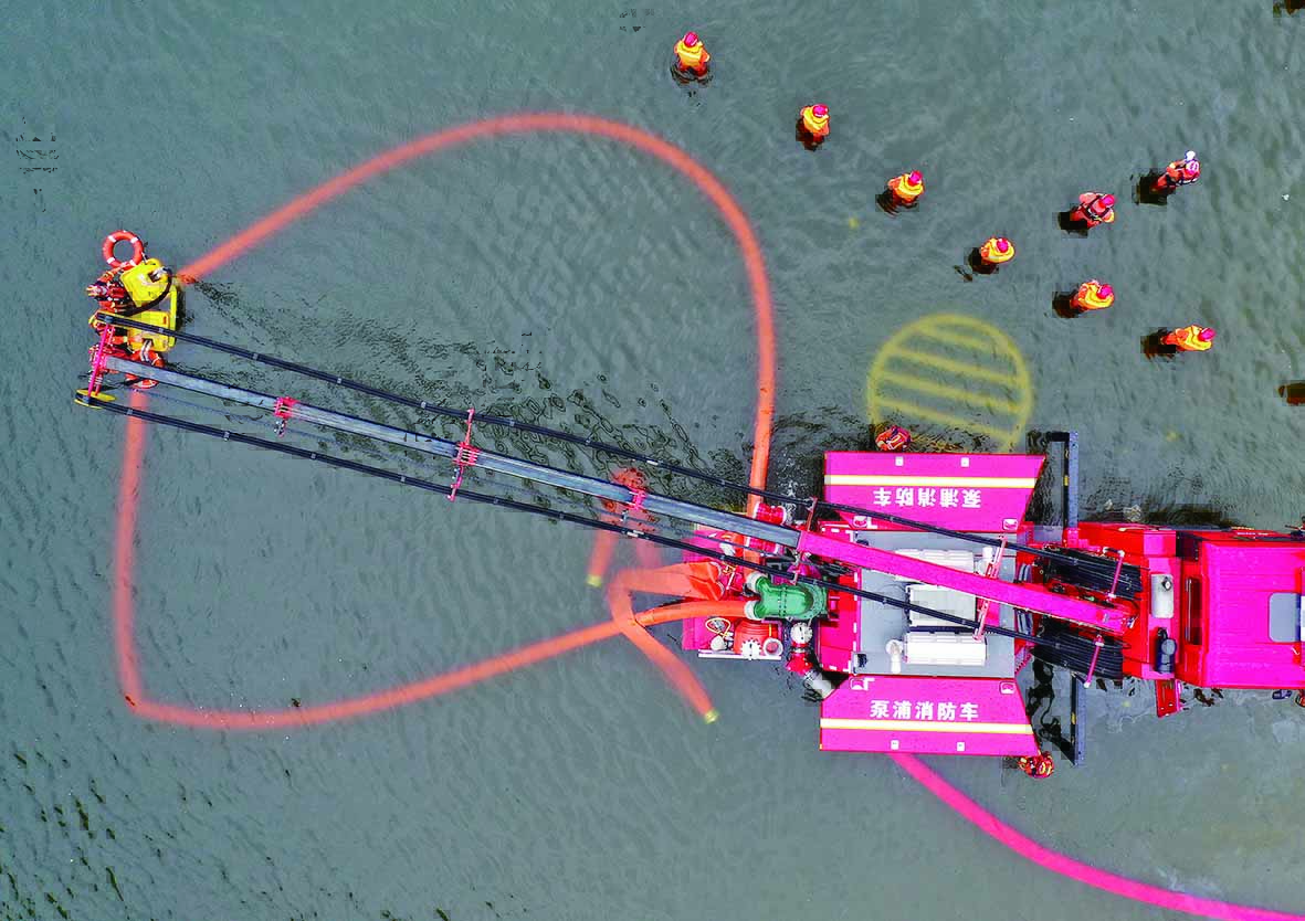 7月28日,消防救援人员在卫辉城区进行排涝作业(无人机照片)。当日,河南省卫辉市的救援排涝工作仍在进行中,救援人员全力转移被困人员并进行排涝作业。