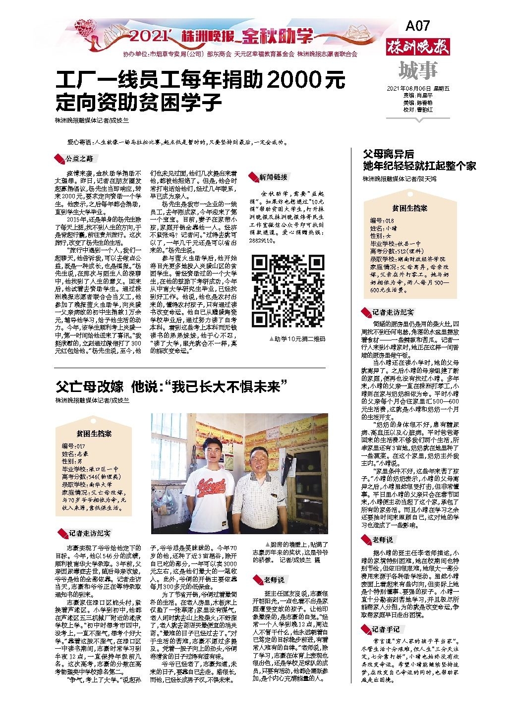 工厂一线员工每年捐助2000元 定向资助贫困学子