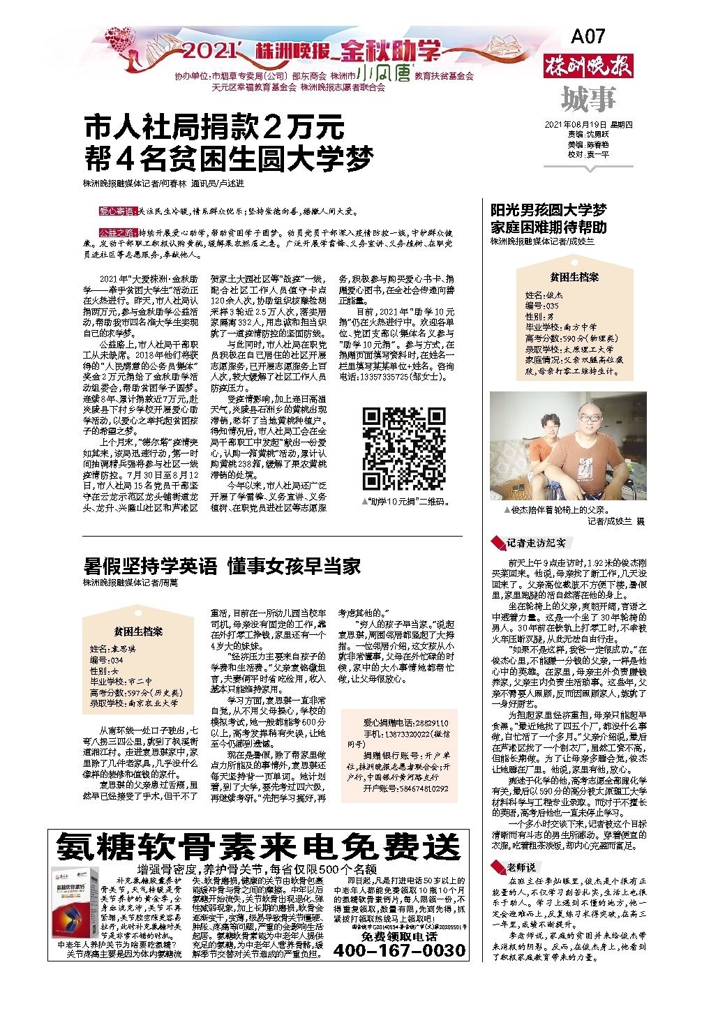 市人社局捐款2万元 帮4名贫困生圆大学梦
