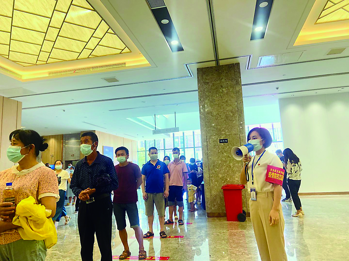在中国动力谷国际学术交流中心检测点,100多名志愿者在不同的区域,为了防控疫情,互相保持着一定的距离。他们拿着扩音器,不停地提醒着,说着几乎同样的话:“请大家保持好一米线的距离,切忌交头接耳。”