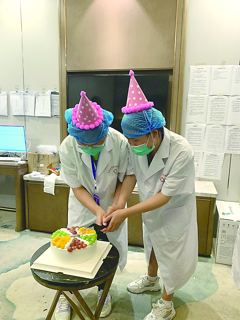 “祝你生日快乐,祝株洲早日战胜疫情。”8月5日晚,天元区一家集中医学观察点里,40岁的陶银花和30岁的郭静洋一起过了一次特别的生日。 8月3日过生日的郭静洋每日忙于隔离人员的核酸检测采样、体温登记、搬送行李、接转运人员……顾不上看手机。直到4日凌晨休息,她才看到家人发来的祝福短信,那一刻,她发现自己的30岁生日已经过去。“从没有以这样的方式过生日,确实难忘。” 该院的护士长陶银花4日运送生活垃圾时,不慎扭伤了脚,每天喷药也未能缓解踝关节肿起来。陶银花的丈夫肖文斌是雷打石镇卫生院的一名医生,夫妻俩几天都没回家了,双双战斗在一线。 (株洲晚报融媒体记者/谭昕吾 摄影报道)