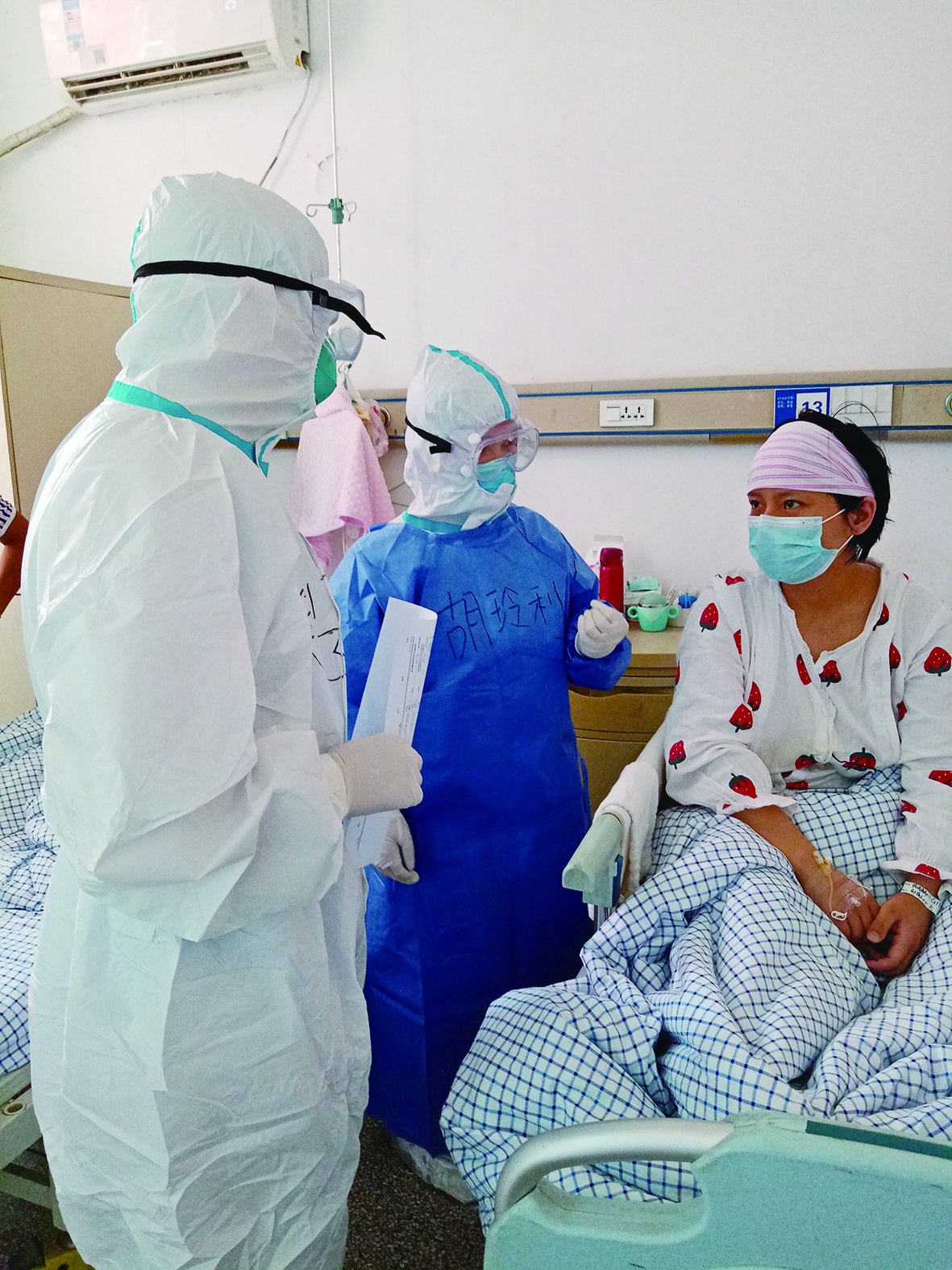 ▲在隔离病房,医护人员询问刘女士的身体状况。通讯员供图