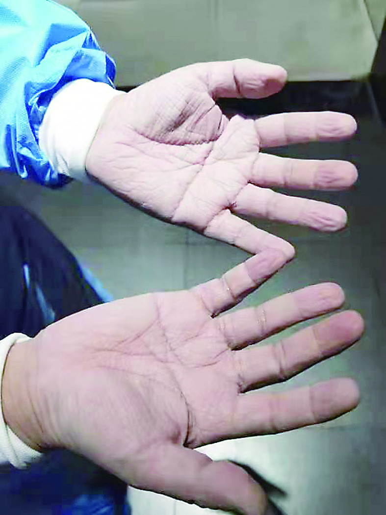 ▲加班到凌晨两点,方舱实验室检测医生的手被消毒水浸泡得皱巴巴的。通讯员供图 A02