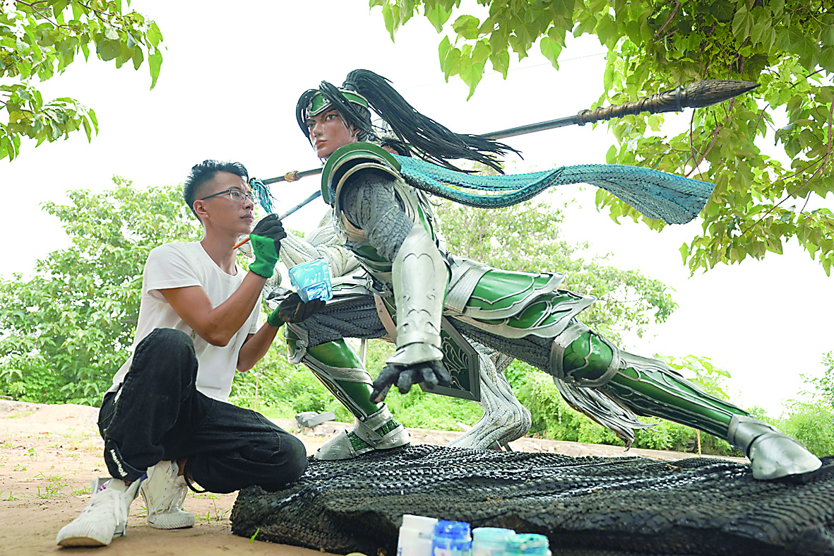 8月10日,曹胜歌在给他创作的轮胎雕塑上色。 现年31岁的曹胜歌是河北省邢台市信都区皇寺镇潭村人。2014年从北方民族大学平面设计系毕业后,曹胜歌回到家乡,发挥所学专业特长,开始了轮胎雕塑创作。经过几年磨炼,曹胜歌制作轮胎雕塑的工艺越来越娴熟,恐龙、野兽、神话人物、十二生肖……这些栩栩如生的雕塑均出自他的巧手。据介绍,制作一件轮胎雕塑,有时需要裁剪上万块轮胎碎片,每件作品根据不同的肌理需要选用不同的轮胎类型。 从2015年至今,曹胜歌已回收50多吨废旧轮胎,制作了众多轮胎雕塑。曹胜歌说,他希望以后可以举办一个废旧轮胎雕塑展览,传递艺术之美和环保理念。