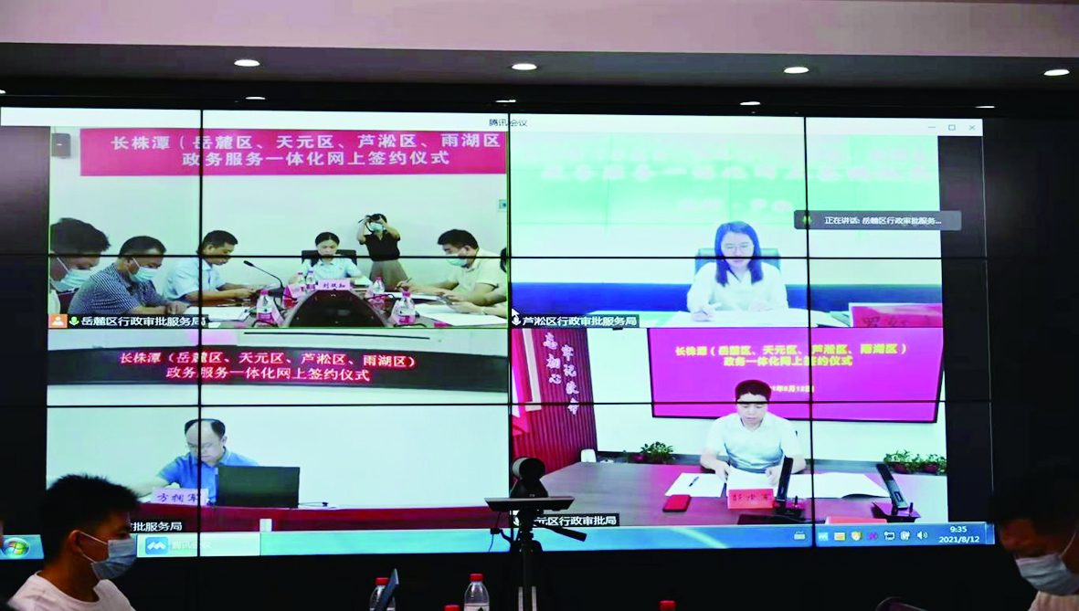 本报讯(株洲晚报融媒体记者/杨凌凌 通讯员/刘秀)“长株潭三市四区政务服务一体化网上签约仪式现在开始!”这是一场疫情下的特殊签约活动。8月12日上午,芦淞区、天元区、长沙市岳麓区、湘潭市雨湖区的行政审批服务局相聚云端,用视频连线的方式开展“云签约”。