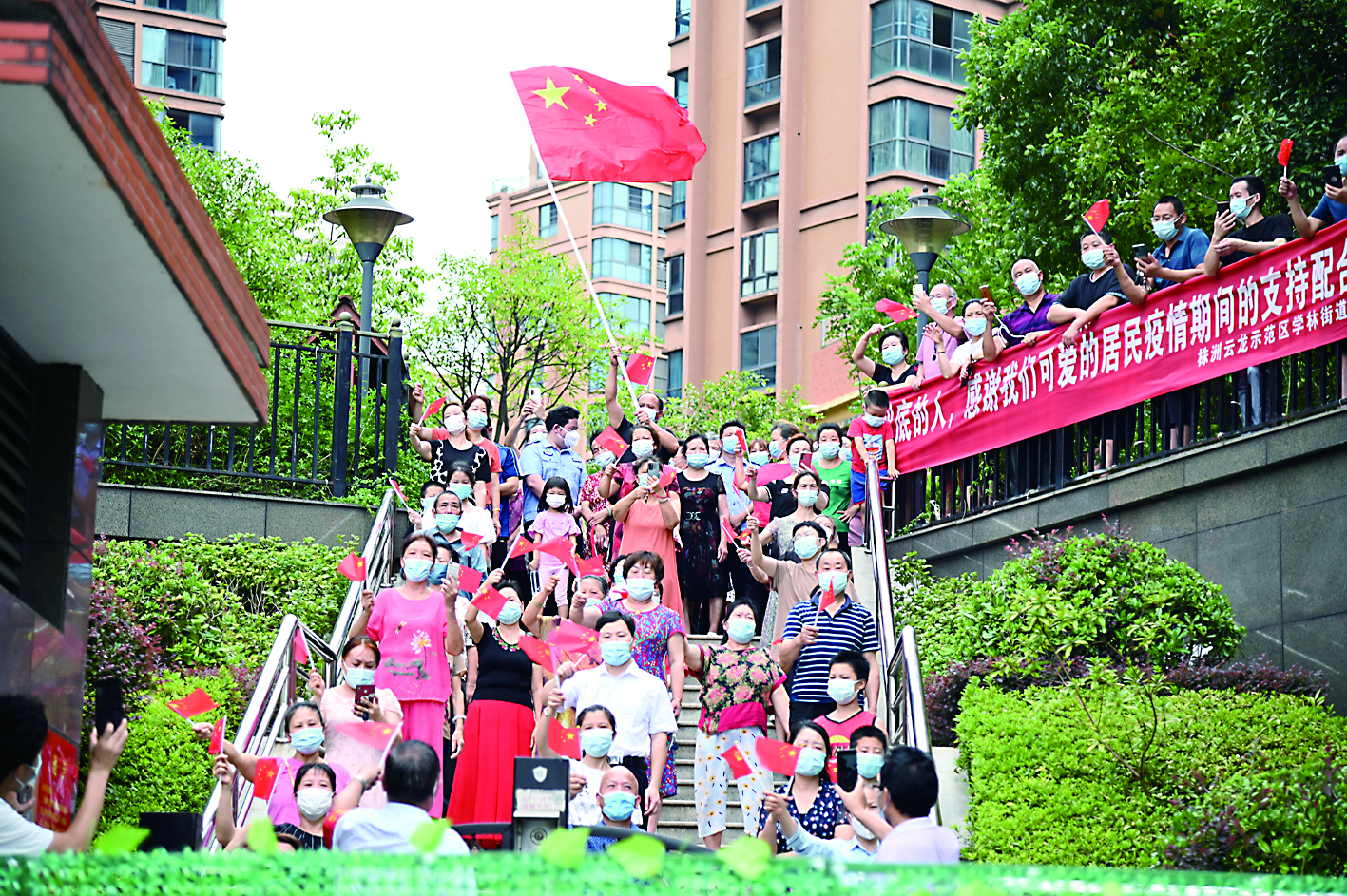 8月13日上午11时许,云龙示范区学林街道学府港湾小区一位居民舞动一面五星红旗,其他居民们则手持小红旗,有序列队,保持间距,齐声高唱《歌唱祖国》。