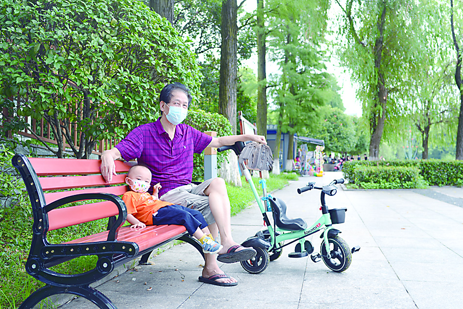 ▲多天“禁足”后,爷孙俩一早来到神农公园休闲。