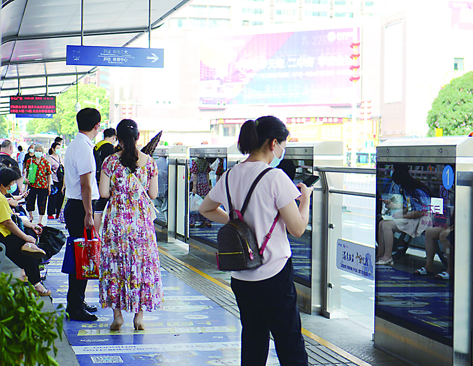 ▲中心广场公交车站内,候车人员多起来了,但大家保持间距。