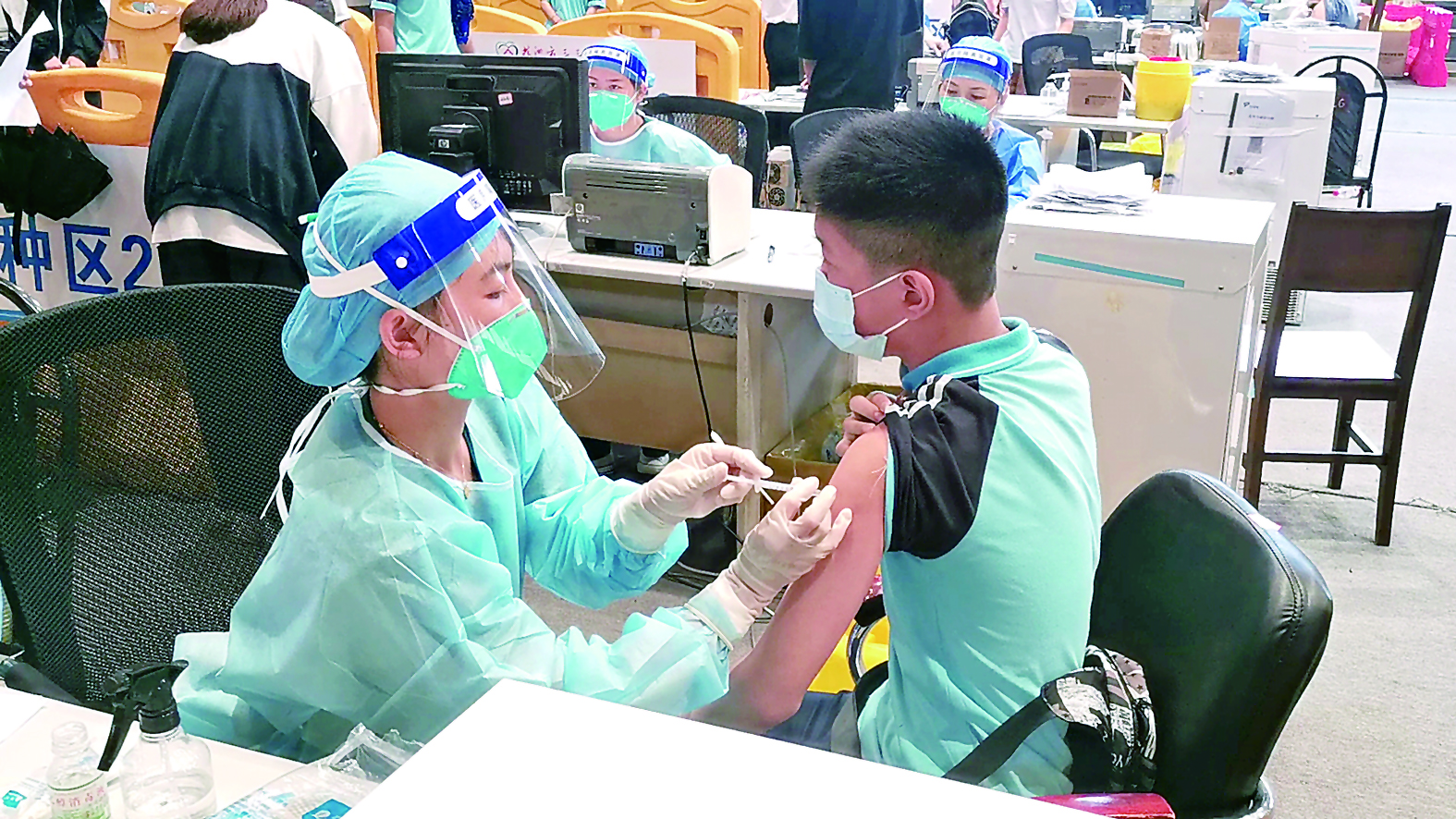 ▲石峰区12岁至17岁学生有序接种疫苗。记者/孙晓静 摄