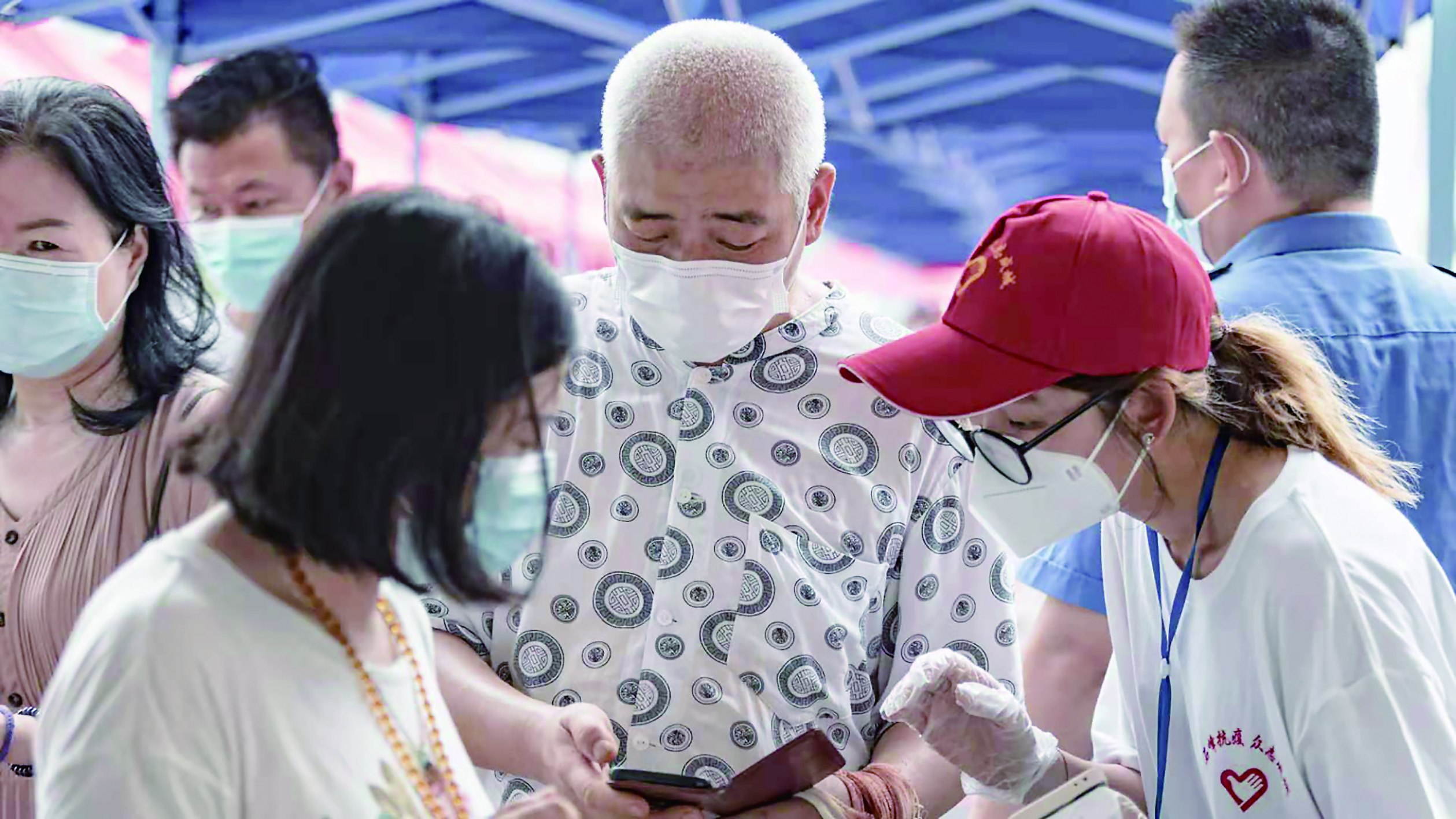 ▲核酸检测前,志愿者帮助老人打开“绿码”。