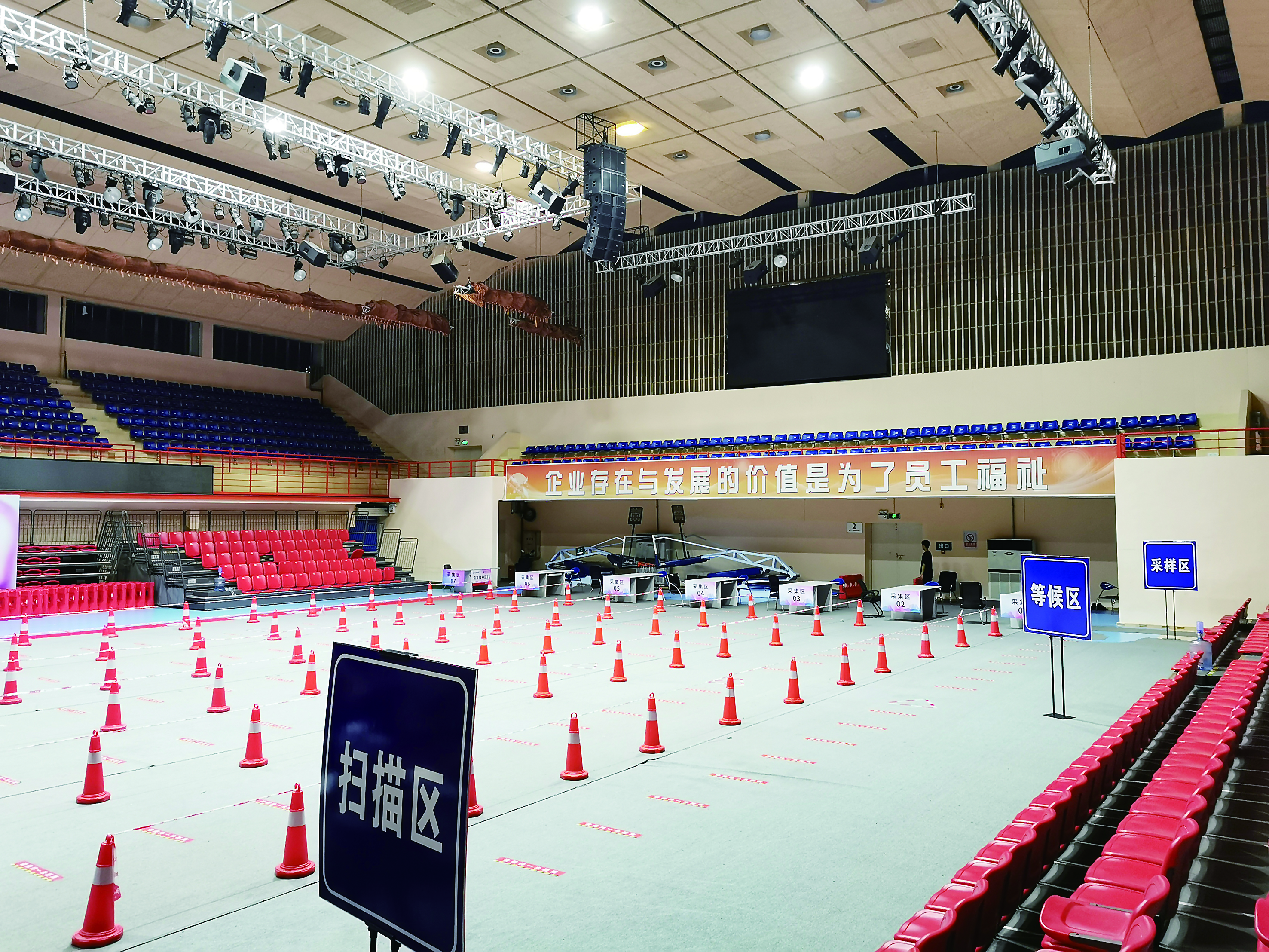 核酸检测需要较为开阔的场地,辖区学校、企业均无偿提供操场、体育馆,并派出工作人员进行协助。