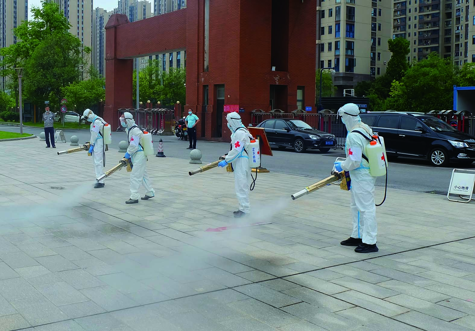 ▲市红十字会志愿者队伍对校园展开消杀工作。 记者/易楚曈 摄