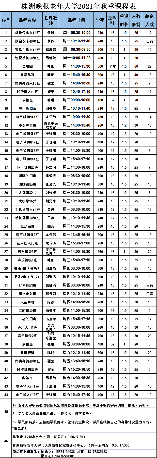 2.报名时请仔细阅读《株洲晚报老年大学2021年计划招生课程安排表》,报名前请谨慎考虑,报名缴费成功后,概不退费。