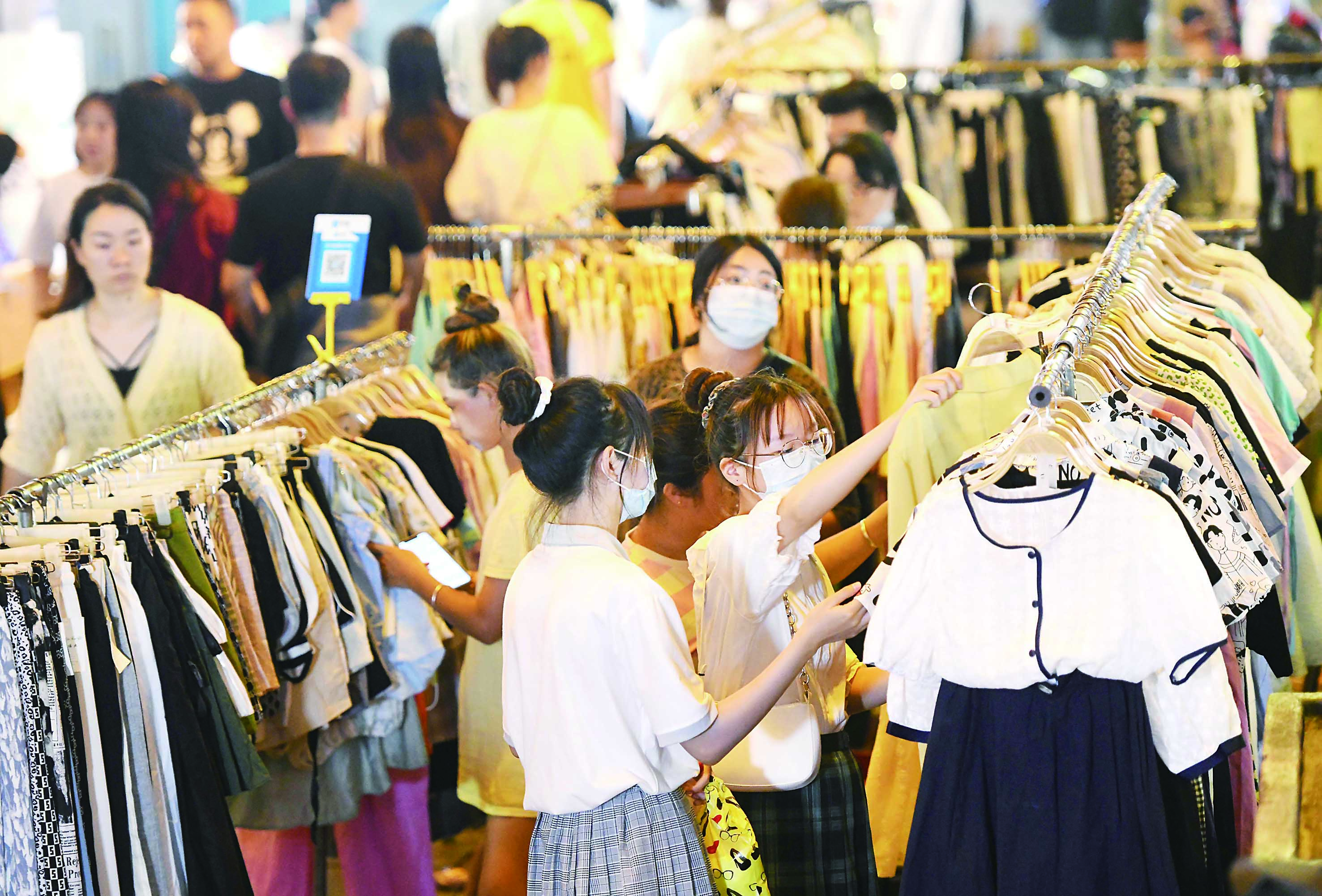 ▲市民在夜市摊上选购衣服。