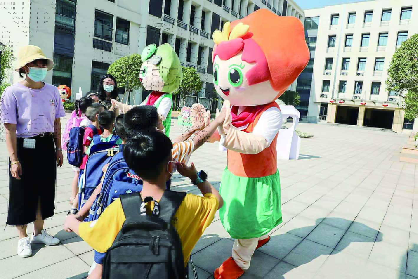 ▲隆兴小学,卡通人迎接新同学。 记者/戴凛 摄