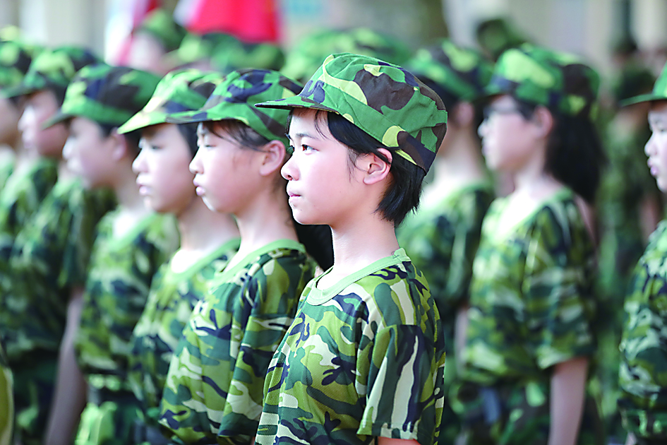 ◀开学第一课,景炎学校开展军事训练。 记者/谭筱 摄