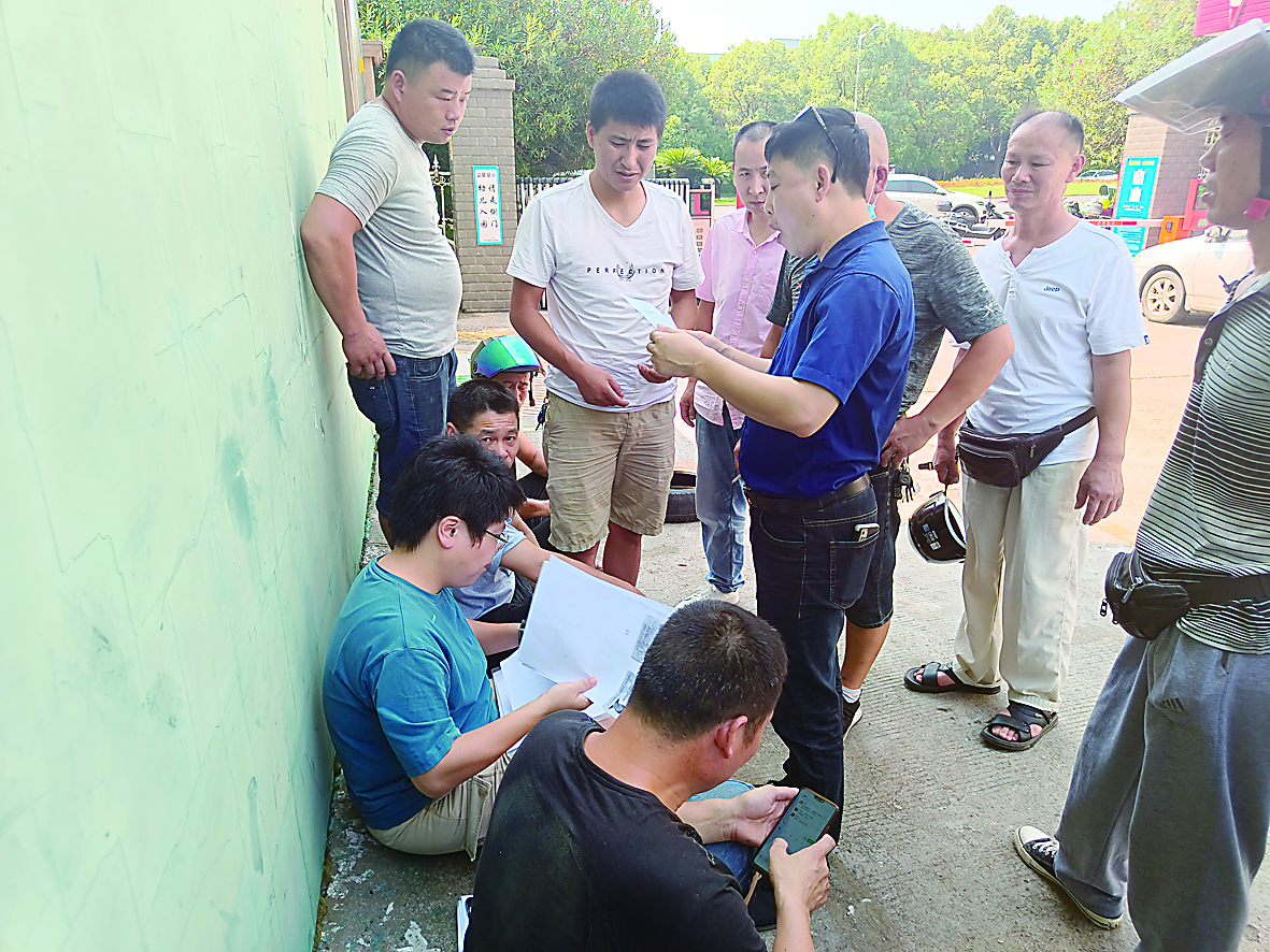 ▲在万嘉装饰门口,项目经理与施工工人在收集资料准备维权。 记者/成姣兰 摄