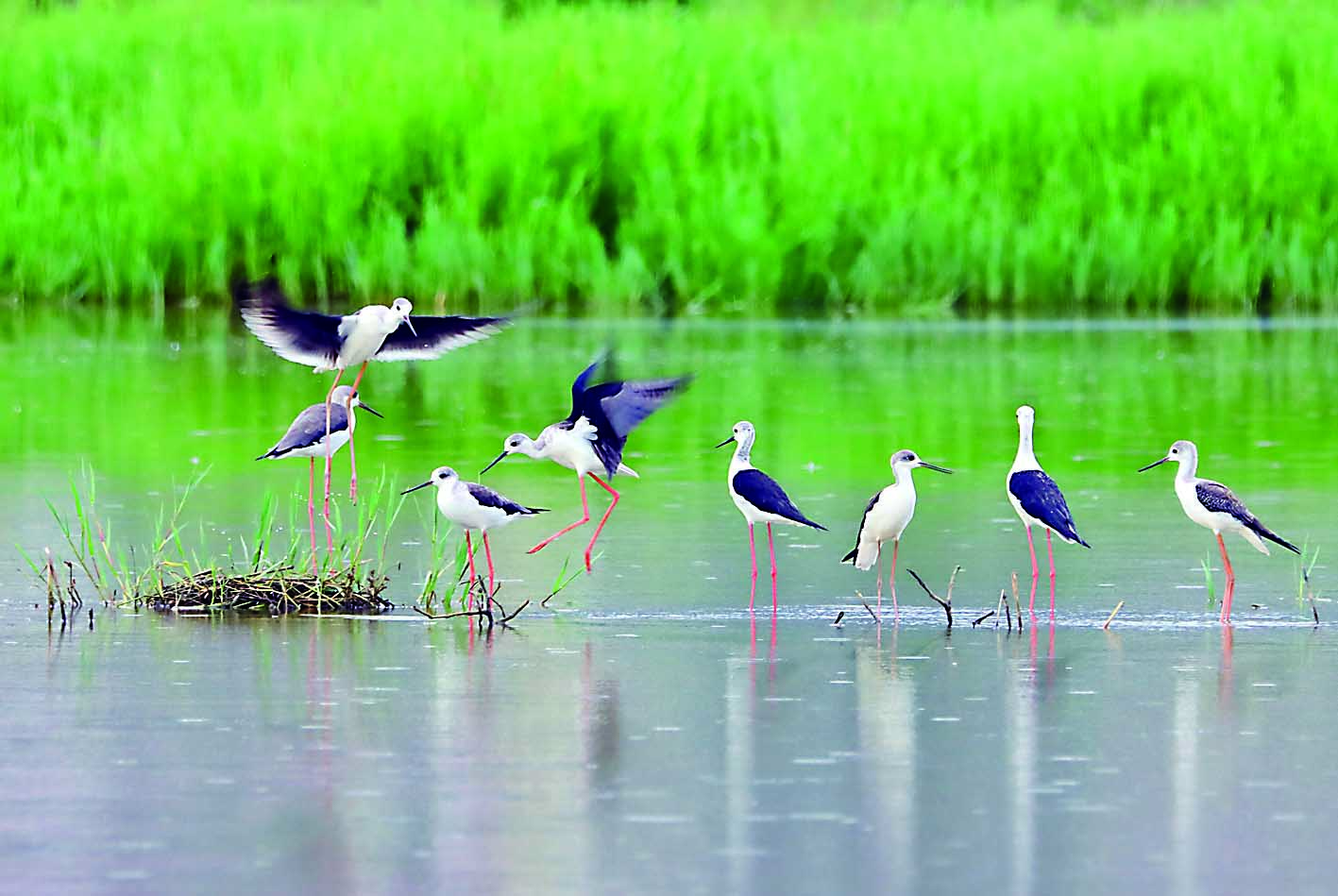 ▲美丽的黑翅长脚鹬在炎陵的山间池塘觅食。通讯员/刘伟文 摄