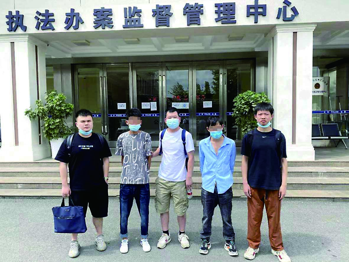 ◀石峰警方从贵州将两名“跑分”嫌疑人(左二、右二)抓获归案。 通讯员供图