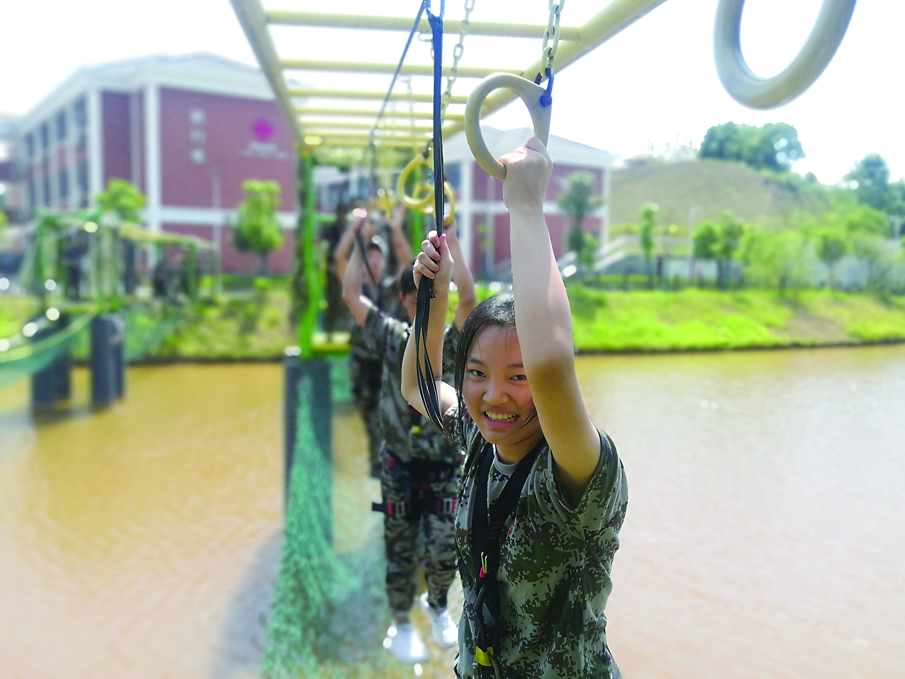 ▲勇 株洲市八中,吊环过“河流”,女生们也不示弱。
