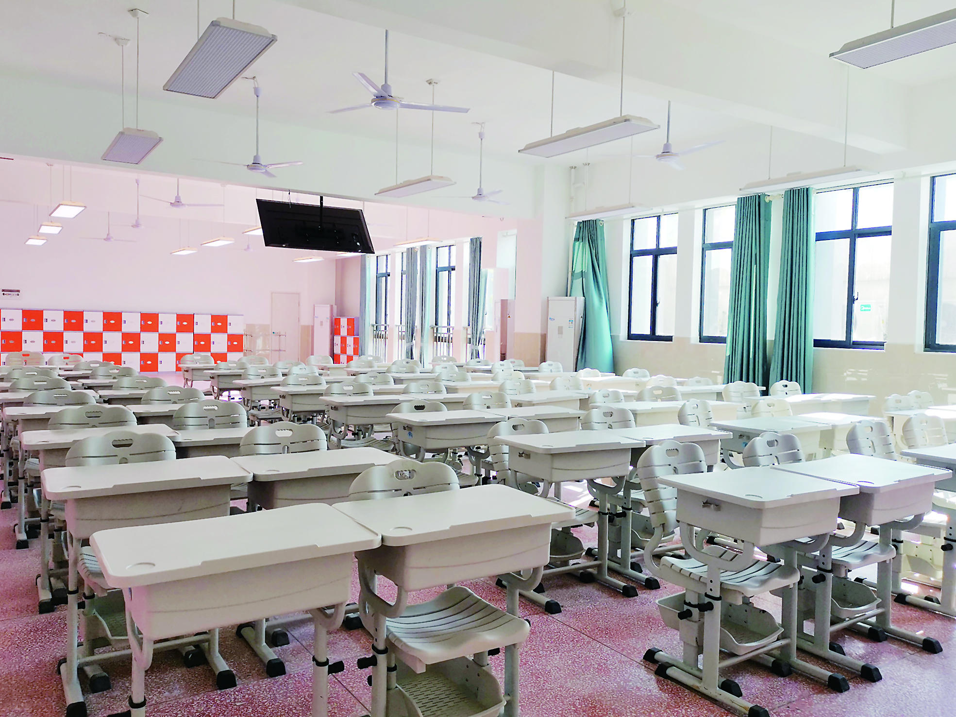 ABS材料的课桌椅,也更符合人体工程学原理,舒适合体。还有大容量的书包柜,一人一个,使用方便。全教室安装的护眼灯,接近自然光特性的光线,全方位保护孩子们的视力。高清晰度的电子班牌,便于选课走班,信息发布和获取。教室前后装有高清摄像头,便于学校和年级的管理者进行课堂教学、网上巡课和学生自主学习纪律监管。