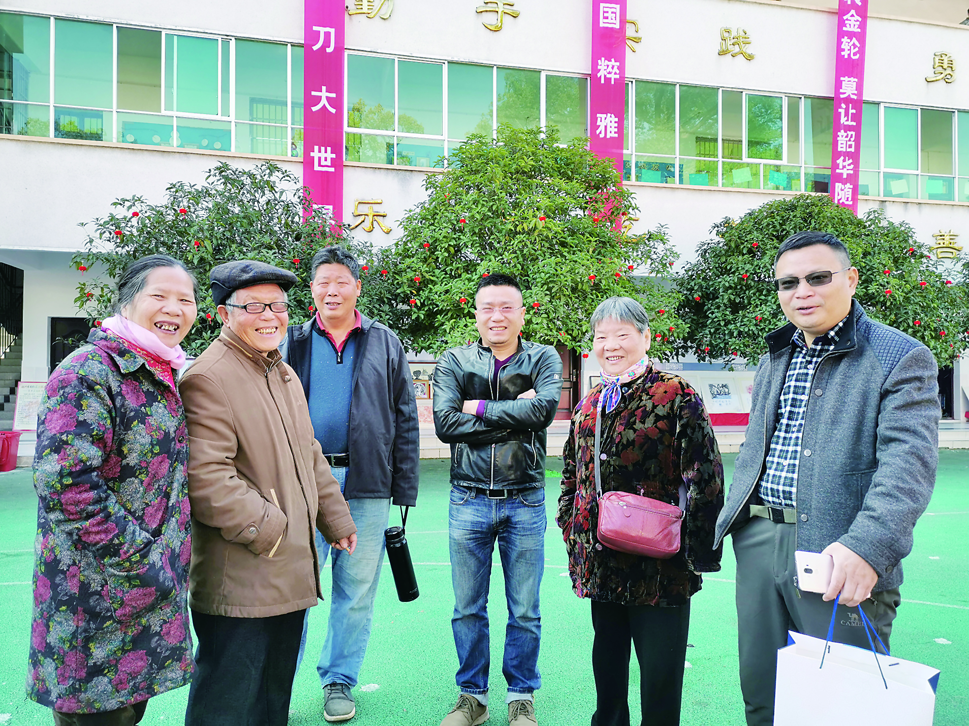 ▲张伯玲(左一)与爱人吴建民(左三)在百井小学参加百年校庆。(资料图) 受访者供图
