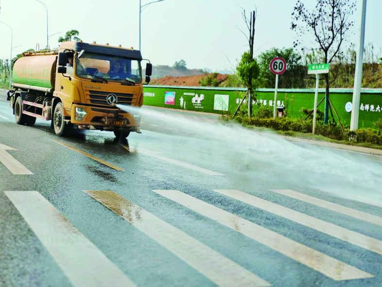 ▲昨天上午,新马大道一工地路段,清洗车不停地冲刷着路面。记者/何春林 摄