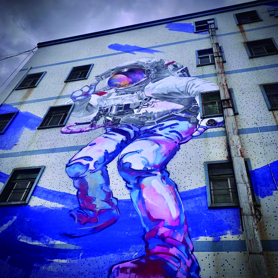 普通人在平地上画画,很容易掌控节奏,但如果是在墙上作画,就需要借助登高设备,且画幅被放大了很多倍数,这就很考验画师的专业水平。