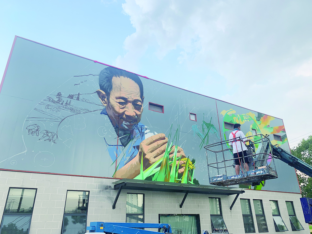 今年8月,李宇冲与长沙市芙蓉区东湖街道表达了自己的想法后,得到了街道的支持和认可,街道帮助他们在袁老的试验田边找到了一个面积有200多平方米、且位于十字路口的墙面,供他们绘制这幅巨幅画像。