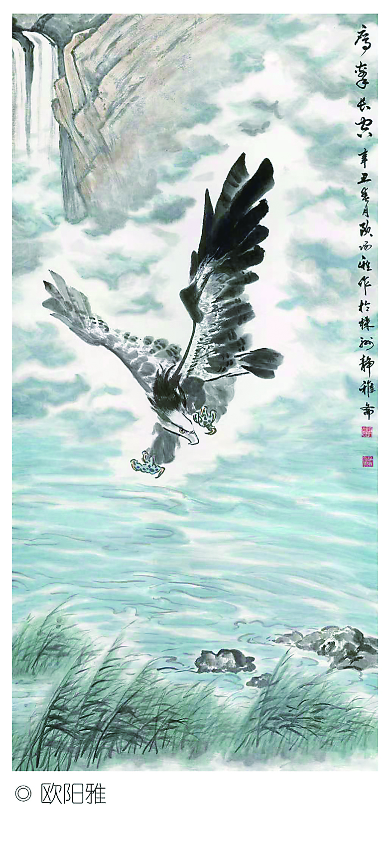 ▶欧阳雅创作的国画作品《鹰击长空》。