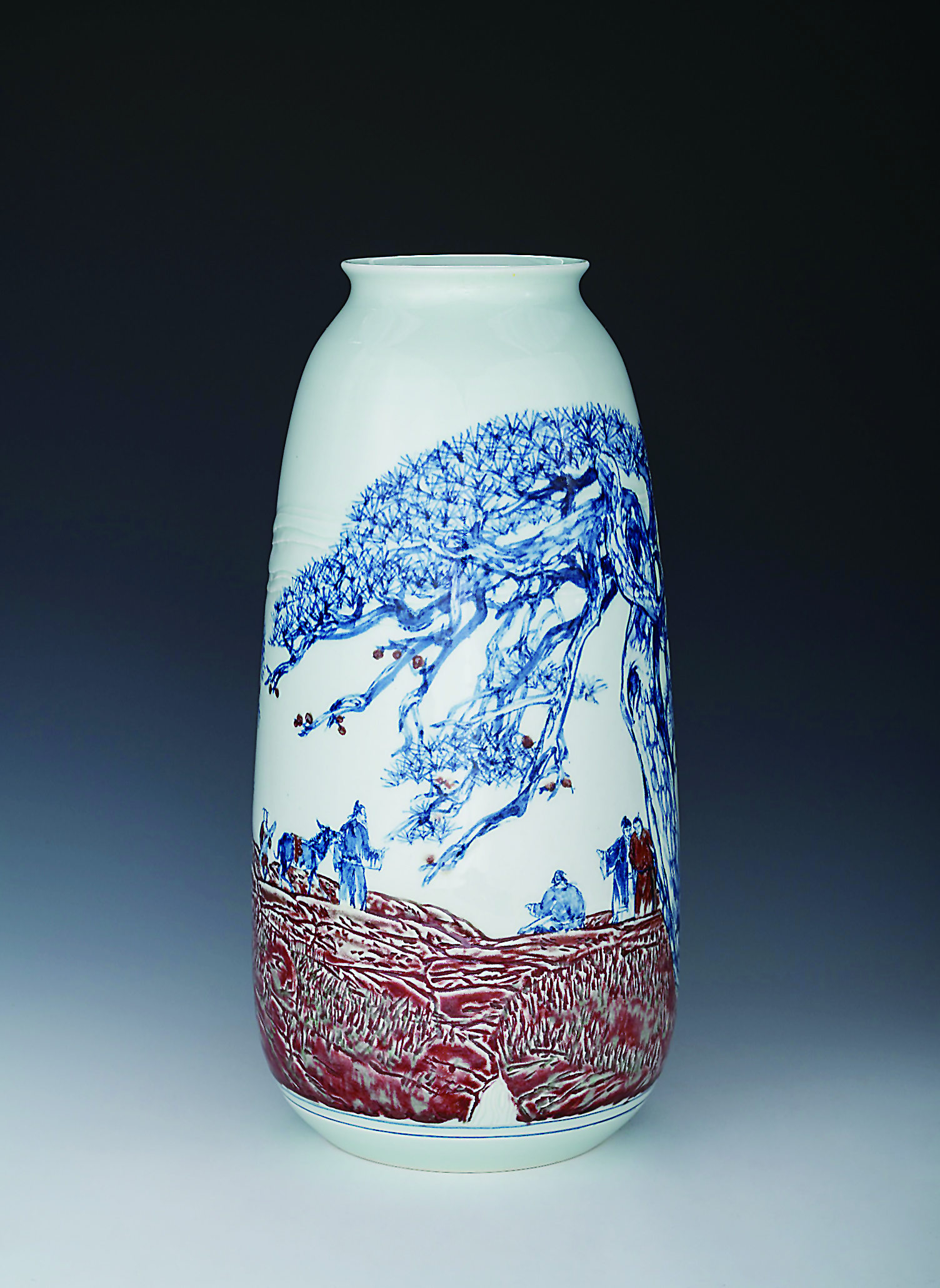 徐庆庚主要研究粉彩和青花艺术瓷,兼事新彩、色釉等装饰。他擅长绘人物、画风景,追求诗韵画意,善于从自然和生活中发现美的形式。其粉彩艺术瓷具有写实和装饰相融合的工笔重彩风格,青花艺术瓷又具有意笔和装饰相融合的写意风格。此件《会友图》画面依据器型竖式构图,运用中国画技法表现题材,兼工带写,设色淡雅。遒劲的古松扎根峻石之上,枝桠旁逸而出,松针苍翠。七位神采各异的古代高士人物在山野之间,松林之下或高谈阔论,或静坐垂钓,图案精致,人物逼真传神,工笔老到细腻。