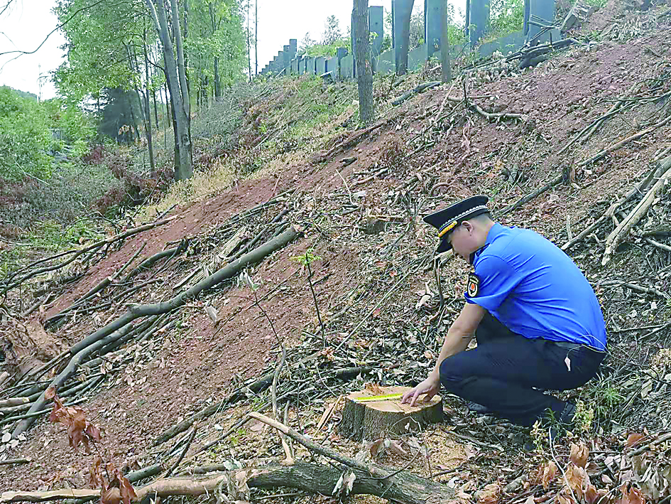 ▲城管执法队员在测量被砍树木的直径。 通讯员供图