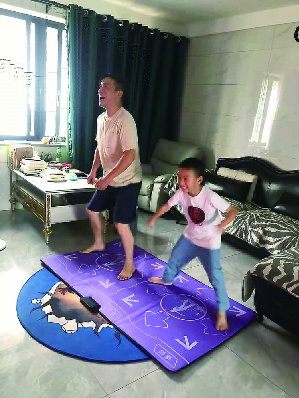 ▲杨舒云跟爸爸一起玩跳舞毯。 通讯员供图