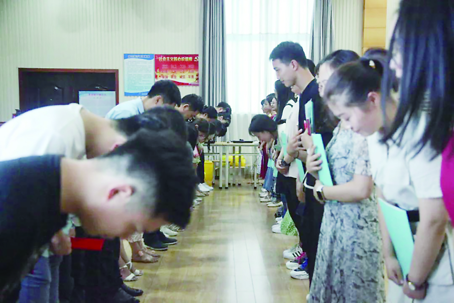 “青蓝工程”师徒结对的拜师仪式上,“师徒”教师互相礼拜。
