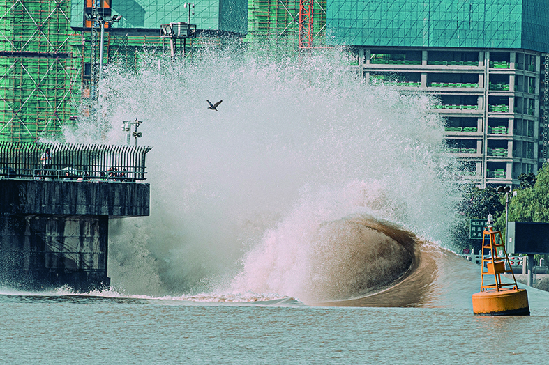 9月23日,是二十四节气中的秋分。今年秋分适逢农历八月十七,钱塘江上迎来滚滚浪潮。钱塘江大潮久负盛名,每年农历八月十八前后是观赏钱塘江潮水的最佳时机。图为钱塘江潮水冲击堤坝形成巨浪。