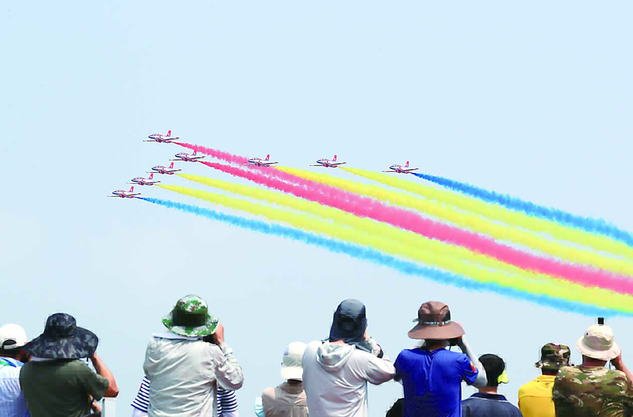 ▲9月28日,中国空军航空大学“红鹰”飞行表演队在第十三届中国国际航空航天博览会开幕式上进行飞行表演。 新华社记者/琚振华 摄