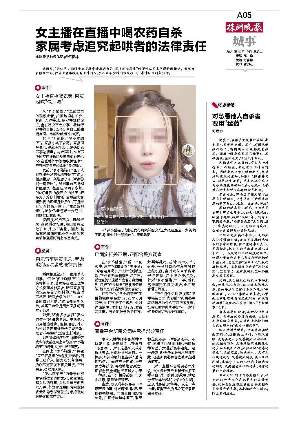 女主播在直播中喝农药自杀 家属考虑追究起哄者的法律责任