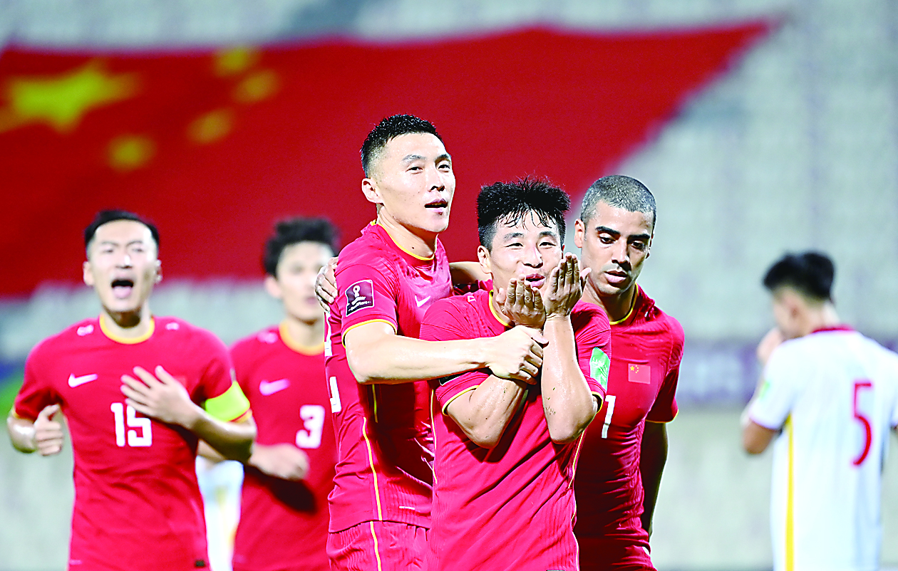 在10月7日举行的2022年卡塔尔世界杯亚洲区预选赛12强赛第三轮比赛中,中国男足凭借张玉宁、武磊的进球在下半场一度取得2比0领先,但在常规时间最后十分钟被越南队连扳两球。武磊在伤停补时最后时刻打入个人第二粒进球,帮助中国队3比2绝杀越南队,取得本届12强赛首胜。10月12日,中国男足将在客场挑战沙特队。图为中国队球员武磊(右三)在比赛中与队友庆祝进球。