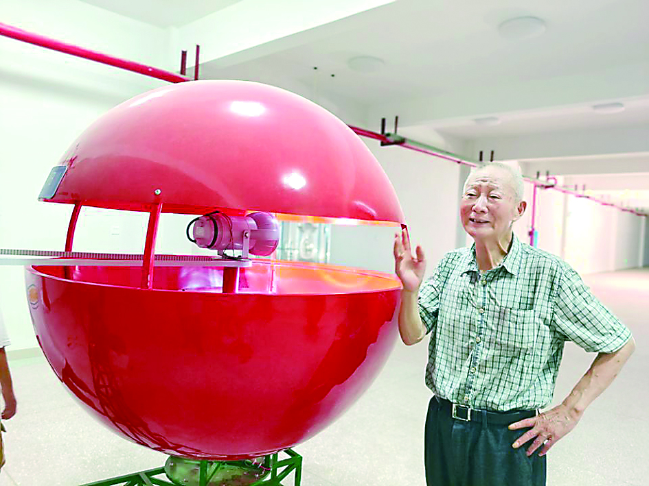 ▶郭选年在一处太阳模型前留影。 记者 何春林 摄