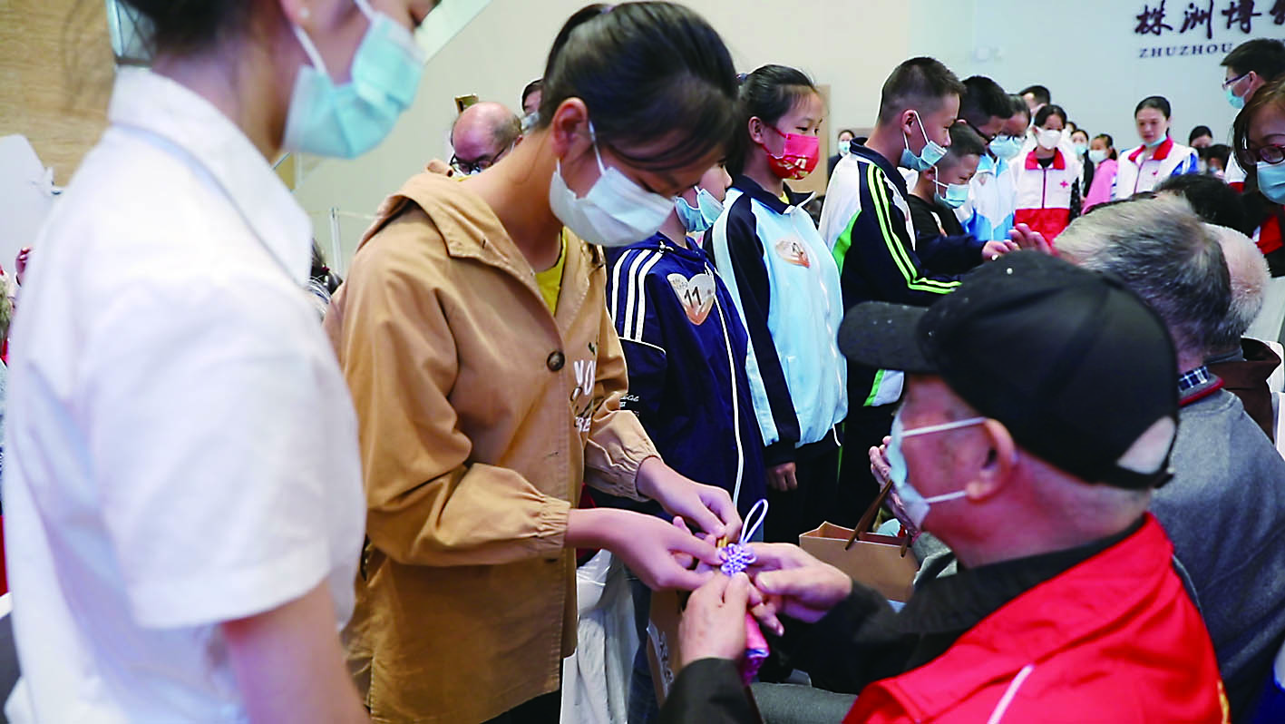 ▲青少年给老人们赠送自己亲手制作的香囊。 记者/李翰 摄