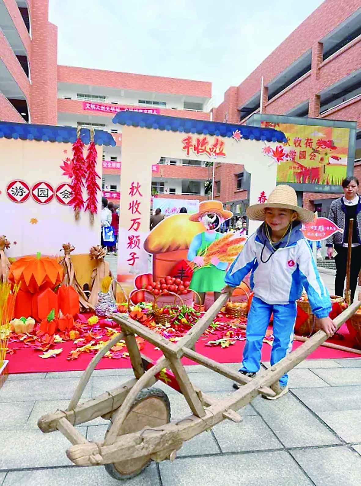 在游园会中,记者看到校园各处都进行了“秋收”主题的布置,除了作为商品的瓜果等食物,还有稻穗、油茶果、桂花枝、狗尾草、芦苇、簸箕、竹篓等元素,让人惊艳。校门口,土车、草帽、扁担、箩筐等农业用具,让人生出怀想。这是乡村的“味道”。
