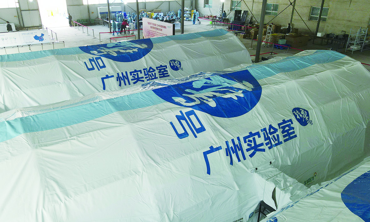 10月24日,经过20多个小时的紧张搭建和调试,一组五舱合一的“猎鹰号”硬气膜实验室在甘肃省兰州市正式投入使用,将帮助当地在短时间内大幅提高核酸检测能力。据了解,“猎鹰号”硬气膜实验室日最高核酸检测能力可达8万管,按10混1采样方式,每天最多可检测80万人次。 图为刚刚搭建投用的“猎鹰”号硬气膜实验室(10月24日摄,无人机照片)。